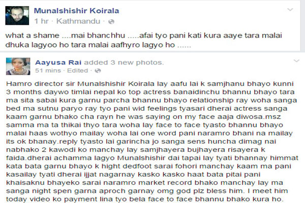 आफुसंग ‘फिलिंग्स’ सहित बेडमा सुत्नुपर्ने प्रस्ताव राखे पनि दिमाग नभएको मान्छे भन्दै आफुले कुनै पनि जवाफ नफर्काएको आयुषाको भनाई छ । आयुषाले फेसबुकमा मात्र नभएर ‘फेस टु फेस’ आफुसंग प्रस्ताव राखेको समेत लेखेकी छिन् । साथै उनले निर्देशक कोइरालालाइ दिमाग नभएको २ कौडीको निर्देशक भन्दै म्युजिक भिडियोमा काम गरेको पैसा समेत बाकि रहेको लेखेकी छन् । आयुषाको सो स्टाटसमा निर्देशक कोइरालाले कमेन्ट गर्दै आफुले यौन प्रस्ताव नराखेको लेखेका छन् ।