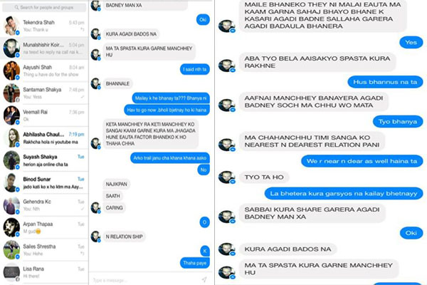 फिल्म ‘बिर्खेलाई चिन्छस्’ बाट नायिकाको रुपमा डेब्यु भएकी आयुषालाई ३ महिनामा नेपालको टप हिरोइन बनाइदिने भन्दै फेसबुक म्यासेजमा र भेटमा ठाडो रुपमा यौन प्रस्ताव राखेको उनले स्टाटसमा लेखेकी छिन् । स्टाटस सहित उनले कोइरालाले आफुसंग च्याटिङ गरेको म्यासेज पनि सार्वजनिक गरेकी छिन् ।