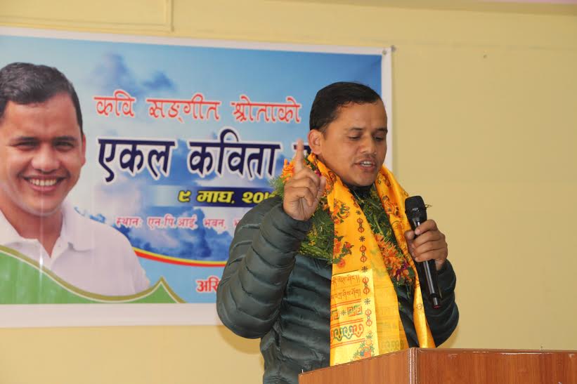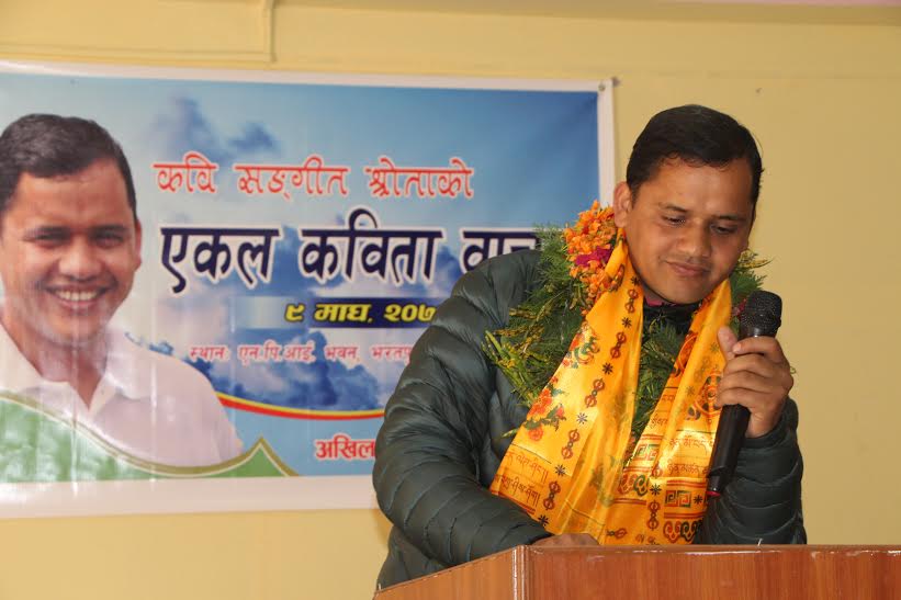 अखिल नेपाल लेखक सङ्घ, चितवनले त्यहाँ कवि सङ्गीतको एकल कविता वाचन कार्यक्रम आयोजना गरेका हो । जहाँ सङ्गीतले आफ्ना १७ वटा कविता वाचन गरेर सुनाए । उनी दर्जनजति कविता सुनाउने तयारीका साथ त्यहाँ पुगेका थिएँ । तर, दर्शकको बलियो आग्रहपछि उनले थप कविता सुनाएका थिए । जतै देखिने पुरुषको उपस्थितीविरुद्ध पनि उनले ‘महिलाहरु कहाँ छन्’ शिर्षकको कवितामार्फत बोले । प्रमुख अतिथिको आसनदेखि राष्ट्रपतिको कार्यलयसम्म पुरुषकै दबदबा रहेको कुरा उनको कविताले बोलिरहेको थियो । कविताको अन्तिम हरफमा उनले सोधे