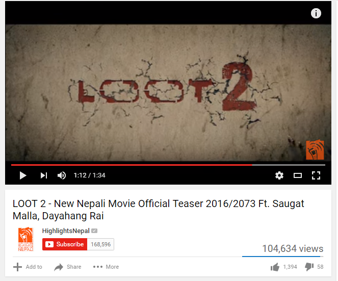 रंग खबर, काठमाडौँ | हिजो मात्र हाइलाइट्स नेपालको युट्युव च्यानलबाट सार्वजनिक गरिएको ‘लुट २’को टिजर १८ घण्टामै १ लाख भन्दा बढीले हेरेका छन् । ब्लकबस्टर फिल्म ‘लुट’को फ्यान फ्लोइङ्ग राम्रो रहेका कारण ‘लुट २’को टिजरलाइ युट्युवमा यति धेरैले हेरेका हुन् । टिजरलाइ युट्युवमा मिस्रित प्रतिक्रिया मिलेको छ ।