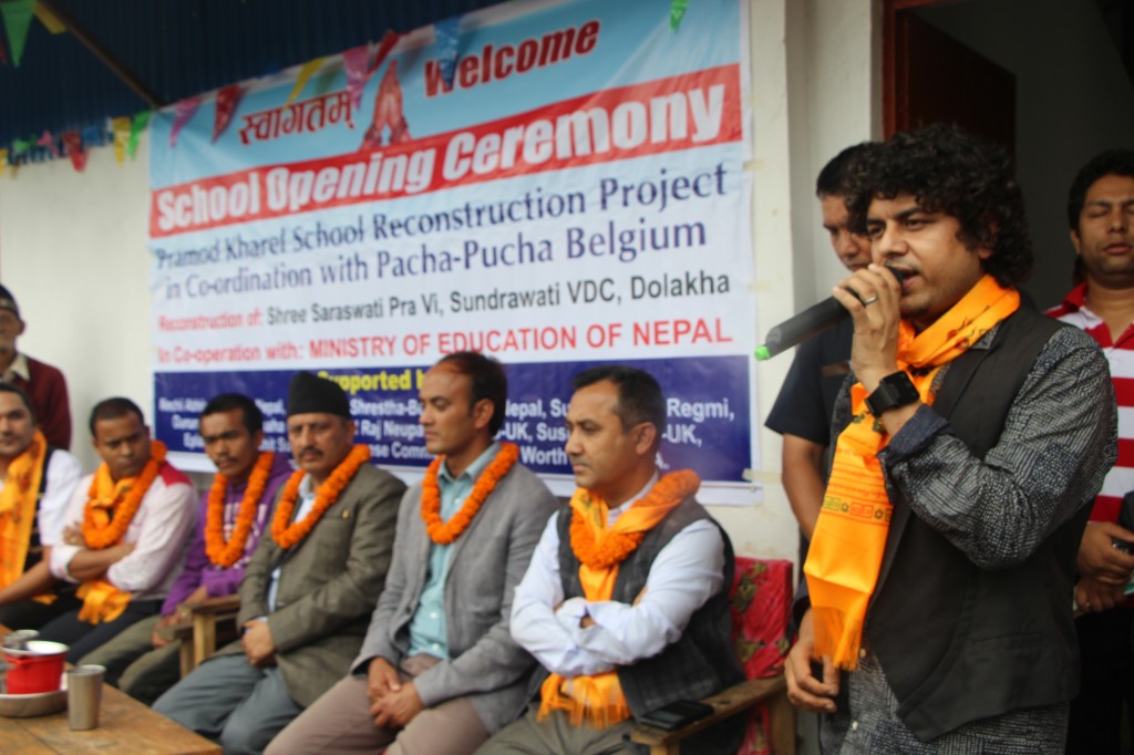 शुक्रवार दिउँसो शिक्षा मन्त्री गिरिराजमणी पोखरेलले विद्यालयको उद्घाटन गरे भने गायक खरेलले विद्यालयको चाबी दिइ स्कुल हस्तान्तरण गरे । कार्यक्रममा कलाकारले शिक्षा क्षेत्रमा देखाएको तदारुकताको शिक्षामन्त्री पोखेरेलले खुलेर प्रशंसा गरे । ‘भुकम्पपछि धेरै विद्यालय क्षतिग्रस्त छन्,’ उनले भने, ‘यसका लागि हामी पनि लागिरहेका छौं र प्रमोदजीहरु पनि आफ्नो स्थानबाट लागिरहनुहोस् भन्ने हामी चाहन्छौं ।’