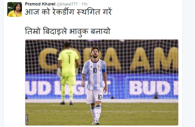 खेलप्रेमी रहेका गायक प्रमोद खरेलले मेसीको सन्यासकै विषयलाई लिएर सोमबार आफ्नो गीत रेकर्डिङ नै स्थगित गरे । ‘आजको रेकर्डिङ स्थगित गरे, तिम्रो विदाईले भावुक बनायो’, प्रमोदले बिहानै आफ्नो टिव्टरमार्फत ट्विट गरेका छन् ।