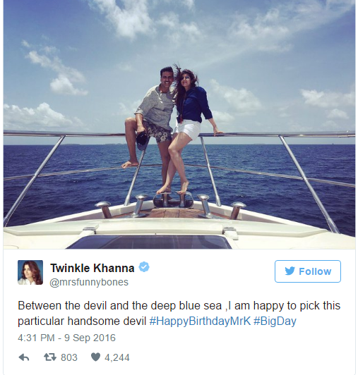 अक्षयले बलिउड सुपरस्टार राजेश खन्नाकी छोरी ट्वीन्कल खन्नालाई आफ्नो जीवन साथी चुनेका थिए । अहिले अक्षयका एक छोरा आरभ र छोरी नितारा रहेका छन् । अक्षय र ट्वीन्कलको जोडी बलिउडमा उदाहरणीय जोडी हो । ट्वीन्कलले अक्षयलाई जन्मदिन सुभ-कामना दिदै ट्वीटरमा यस्तो पोस्ट गरेकी छिन ।