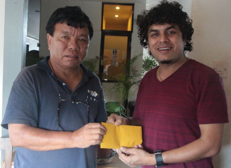 म्यागासेसे विजेता सामाजिक अभियन्ता महावीर पुनको आविष्कार केन्द्र निर्माणको अभियानमा गायक प्रमोद खरेलले १ लाख बढीको सहयोग हस्तान्तरण गर्दै
