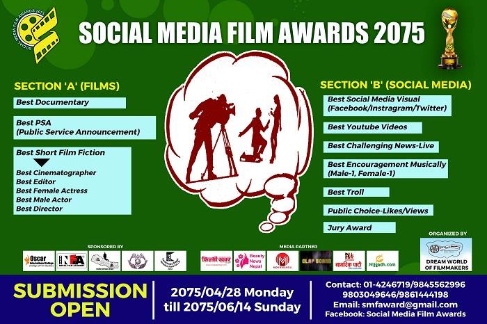 रंगखबर, काठमाडौँ- म्यूजिकल्लीदेखी डकुमेन्ट्रीसम्म ‘सोसल मिडिया फिल्म अवार्ड २०७५’ आयोजना हुने भएको छ। ‘ड्रिम वर्ल्ड अफ फिल्म मेकर्स’को आयोजनमा अवार्ड हुने भएको हो। छोटो समयको सन्देशमूलक चलचित्र निर्माण गरि सामाजिक सञ्जालमार्फत सार्वजनिक गर्दै आएका संघ-संस्था वा व्यक्तिलाई सम्मान गर्न अवार्डको आयोजना गरेको आयोजक संस्थाका अध्यक्ष एवम् निर्देशक सवनम मुखियाले बताइन्। उनले भनिन् ‘आजको युगमा सबै व्यक्तिहरुलाई स्वतन्त्र ढंगले आफ्नो अभिव्यक्ति सामाजिक सञ्जालमार्फत व्यक्त गर्ने संस्कार नै बनिसकेको देखिन्छ। सकारात्मक र सही सूचना दिने सामाजिक सञ्जालमा अपलोड गरेका चलचित्रहरु साह्रै मन छुने रहेको पनि पाइन्छ। यस्ता छोटो समयको चलचित्र निर्माण गर्ने व्यक्ति एवम संस्थाहरुलाई हौसला र अवसर दिई उहाँहरुको सिर्जनालाई सम्मान गर्दै जनमानसमाझ ल्याउनको लागि यो अवार्डको स्थापना गरिएको हो।’ अवार्डको आवेदन पनि खुल्ला गरिएको छ। आवेदकले ‘ड्रिम वर्ल्ड अफ फिल्म मेकर्स’को अफिसमा गइ आवेदन फारम भर्न सक्नेछन्। अनलाइनबाट पनि फारम भर्न मिल्ने व्यपस्था मिलाइएको आयोजक टिमले जनाएको छ। सामाजिक सञ्जाल निकट अवार्ड १६ विधामा प्रदान गरिनेछ। ‘अस्कर इन्टरनेशनल कलेज अफ फिल्म स्टडीज्’, ‘नेपाल फिल्म एकडेमी’, ‘प्राचीन सम्पदा नेपाल’, ‘अमर रत्न फिल्मस्’, ‘काशी खण्ड कृषि फार्म’ले अवार्ड कार्यक्रमलाई प्रायोजन गर्दैछन्। माघमा हुने अवार्डको स्थान चाँडै नै सार्वजनिक गर्ने सवनमले जनाइन्।