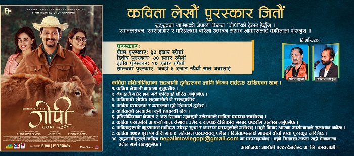 रंगखबर, काठमाडौँ – माघ १८ गते रिलिज हुने फिल्म ‘गोपी’ले प्रचारका लागि नयाँ तरिका ल्याएको छ । फिल्मको ट्रेलर हेरेका दर्शकसँग सम्बन्धित रहेर निर्माण पक्षले कविता प्रतियोगिता आव्हान गरेको छ ।