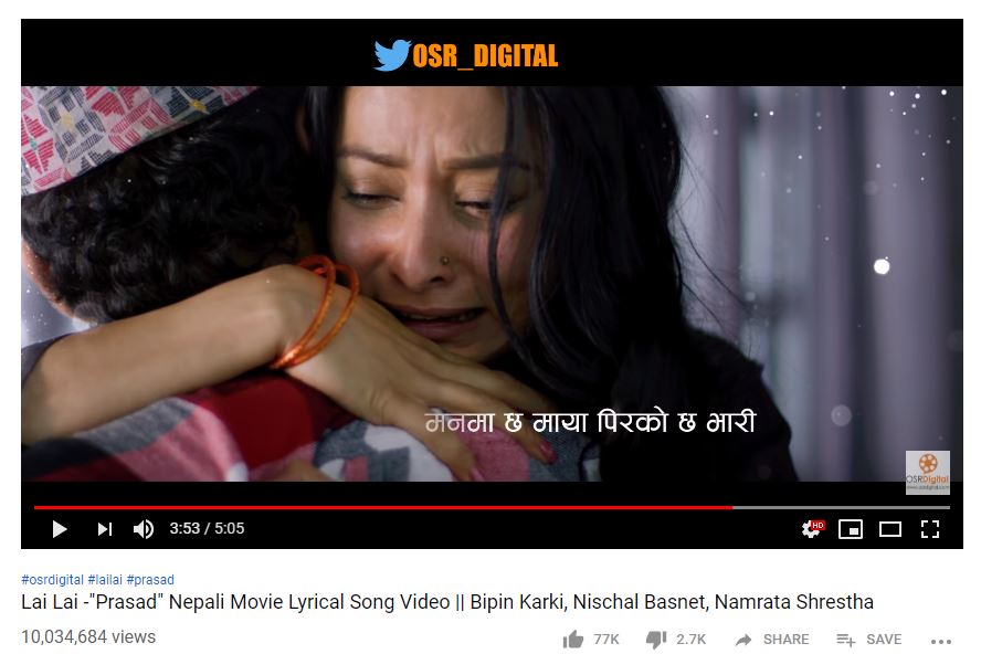 रंगखबर, काठमाडौँ – फिल्म ‘प्रसाद’का दुई गीत एकै दिन युट्युबको करोड भ्युज क्लबमा इन्ट्री भएका छन् । ‘लै लै’ र ‘बन्की चरी’ बोलका गीत करिब १ महिनाको अन्तरालमा अपलोड भएका थिए ।