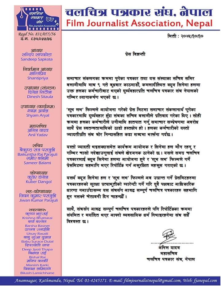 महासचिव अनिल यादवले जारि गरिएको विज्ञप्तिमा भनिएको छ ‘शुभ लभ’ फिल्मले आयोजना गरेको प्रेसमिटमा समाचार संकलानार्थ पुगेका पत्रकार माथि दुर्व्यवहार हुँदा संघका सचिव बलामीले प्रतिवाद गरेका थिए । यस्तो ज्यादती हुँदासम्म कार्यक्रम आयोजक र सिनेमा हल मौन रहनु र गम्भीर चासो नदेखाउनुलाई संघले खेदजनक ठानेको छ ।
