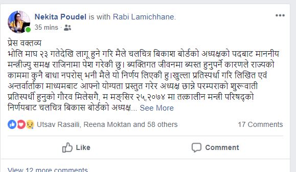 भोलि माघ २३ गतेदेखि लागू हुने गरि मैले चलचित्र बिकाश बोर्डको अध्यक्षको पदबाट माननीय मन्त्रीज्यु समक्ष राजिनामा पेश गरेकी छु। ब्यक्तिगत जीवनमा ब्यस्त हुनुपर्ने कारणले राज्यको काममा कुनै बाधा नपरोस् भनी मैले यो निर्णय लिएकी हु।खुल्ला प्रतिस्पर्धा गरि लिखित एवं अन्तर्वार्ताका माध्यमबाट आफ्नो योग्यता प्रस्तुत गरेर अध्यक्ष छान्ने परम्पराको शुरूवाती प्रतिस्पर्धी हुनुको गौरव मिलेसगै, म मङ्सिर २५,२०७४ मा तत्कालीन मन्त्री परिषद्को निर्णयबाट चलचित्र बिकास बोर्डको अध्यक्ष पदमा नियुक्त भएको स्मरण गराउन चाहन्छु। योसगै नेपाली चलचित्र क्षेत्रको इतिहासमा पहिलो पटक बक्स अफिस प्रणालीको शुरूवात गर्ने गौरव प्राप्त हुनु र नेपाल चलचित्र बिकाश बोर्डकै पहिलो महिला अध्यक्ष हुन पाउनुपनि मेरालागि विशेष अवसर भएका छन्। यस बाहेक,आजसम्म दिइएका सम्पुर्ण जिम्मेवारी मन्त्रालयले तोकेको समय-सीमा भित्रै सफलतापुर्वक समापन गरिएको रिपोर्ट सहितको प्रगति विवरण माननीय मन्त्रीज्यु समक्ष आजै बुझाईसकेकी छु।उर्जावान नयाँ पुस्ताका चलचित्रकर्मीहरुलाई प्रोत्साहन तथा बिशिष्ट आदरणीय चलचित्रकर्मीहरुको सम्मानमा केही उल्लेख्य कामको शुरूवात गर्ने अवसर मिल्यो। यो मेरालागि ठुलो उपलब्धि भएको छ। सम्पुर्ण चलचित्र क्षेत्रको हितकालागि मेरो १४ महिने कार्यकाल पर्याप्त नभएपनि दीर्घकालीन उपलब्धिका कयौं संभावनाका ढोकाहरु खुलाउन मेरो प्रयास महत्वपूर्ण भएको ठानेकी छु। बक्स अफिसका अलावा,नेपाली चलचित्रका गौरवमय इतिहासको रक्षार्थ डिजिटलाइजेशन सहित अभिलेख ब्यवस्थापन,चलचित्र नगरीको अध्ययन, स्वदेशी तथा बिदेशी लगानीकर्ताहरुको सम्मेलनको अवधारणा,सन्देश मुलक चलचित्रलाई करमा सहुलियत, ,बिशिस्ट चलचित्रकर्मीकालागि उपचार लगायतमा सहयोगमा रकम थप, देशका विभिन्न समुदाय, जात जाती, भाषा भाषीहरुका चलचित्रहरुलाई प्रोत्साहन र सम्मान लगायतका धेरै कामहरु, केहि सम्पन्न र केही शुरूवात भएका छन्। यो छोटो कार्यकाललाई उपलब्धिपुर्ण बनाउन सहयोग गर्नु भएकोमा माननीय सन्चार तथा सूचना प्रबिधि मन्त्री श्री गोकुल बास्कोटा ज्यु, संचार सचिव ज्यु लगायत सम्पुर्ण मन्त्रालय र नेपाल चलचित्र बिकास बोर्डका सम्पुर्ण परिवार प्रति कृतज्ञता व्यक्त गर्दछु। मुलुकको सेवा गर्ने अवसर पाएकोमा म नेपाल सरकार एवं सम्मानिय प्रधानमन्त्री ज्यु प्रती आभार प्रकट गर्दछु।