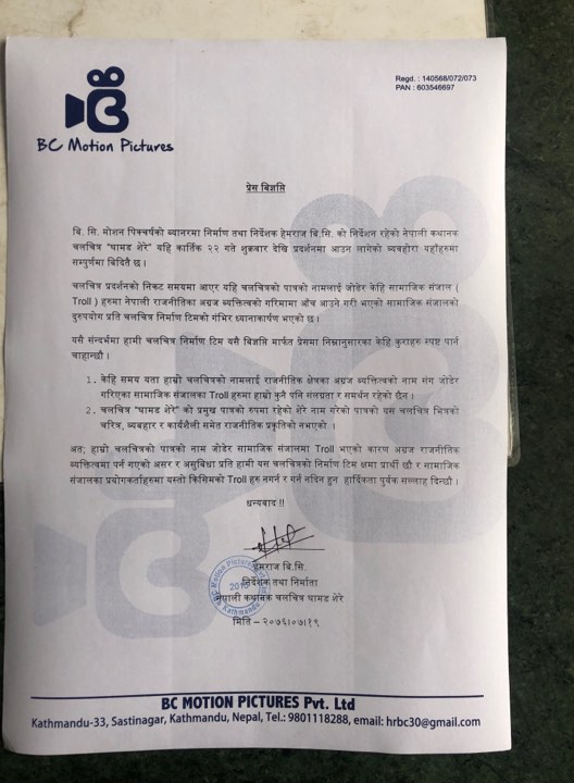 बुधबार बोलाइएको आकस्मिक प्रेसमिटमा सामाजिक संजालमा आइरहेका ट्रोलसँग सिनेमाको कुनै सम्बन्ध नरहेको प्रष्ट पारिएको छ । निर्माण कम्पनि बिसी मोसन पिक्चर्सले विज्ञप्तिमा भनेको छ ‘कथाको मुख्य पात्र शेरेको चरित्र, व्यवहार र कार्यशैलीसमेत राजनीतिक व्यक्तित्वसँग मेल खाँदैन ।’