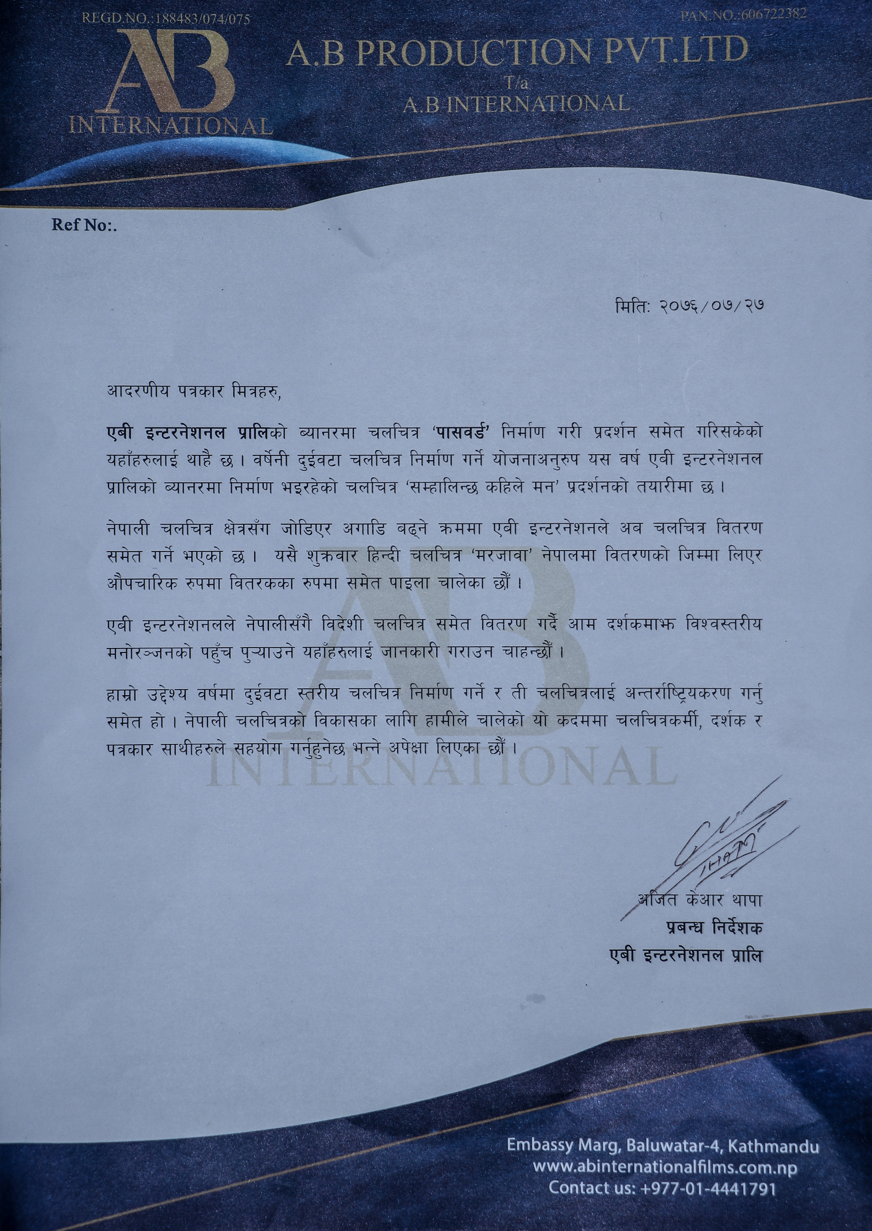 ‘पासवर्ड’ निर्माण कम्पनि एबी इन्टरनेशनलले फिल्म वितरण गर्ने