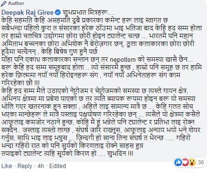 ‘भारतमा नेपोटिज्मको कुरा उठ्ना साथ यता पनि सुरु गरे साथीहरुले तर हामि कहाँ ‘नेपोटिज्म’ होइन, ‘नेप्टोजम’ र ‘चेप्टोजम’को समस्या छ । गलत मान्छेहरु यहि दाउरोमा भात पकाउछ्न ।’ उनले लेखेका छन् ।
