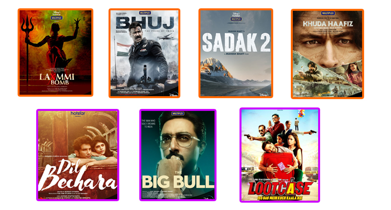 अक्षय कुमार स्टारर ‘लक्ष्मीबम्ब’, अजय देवगण र संजय दत्तको ‘भुज’, संजय दत्त, अलिया भट्ट, आदित्य रोय कपूर स्टारर ‘सडक २’, अभिषेक बच्चन, इलियाना डिक्रुज स्टारर ‘द बिग बुल’, स्वर्गीय सुशान्त सिंह राजपुत स्टारर ‘दिल बिचारा’ डिज्नी प्लस हटस्टारमा रिलिज हुनेछन ।