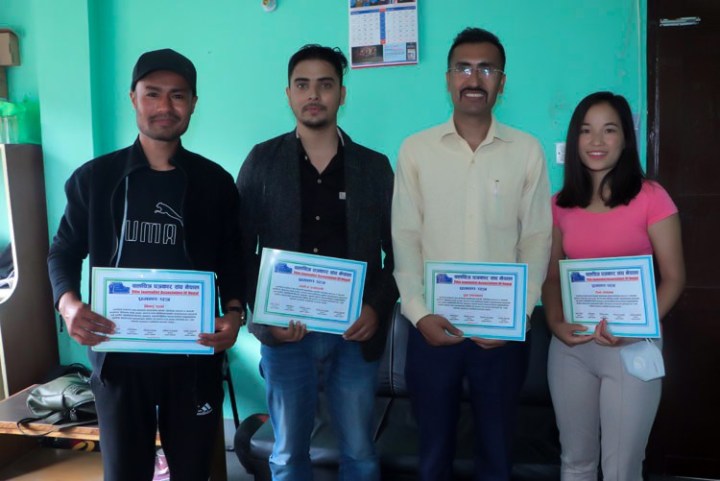 शनिबार संघको केन्द्रिय कार्यालय अनामनगरमा प्रथम हुने पत्रकार ध्रुव लम्सालसहित क्रमश: दोस्रो, तेस्रो र चौथों स्थान हाँसिल गर्ने विष्णु शर्मा, मनोज न्यौपाने र रीना मोक्तानलाई प्रमाणपत्रसहित १५ हजार, १० हजार र ५/५ हजार नगद प्रदान गरिएको हो ।