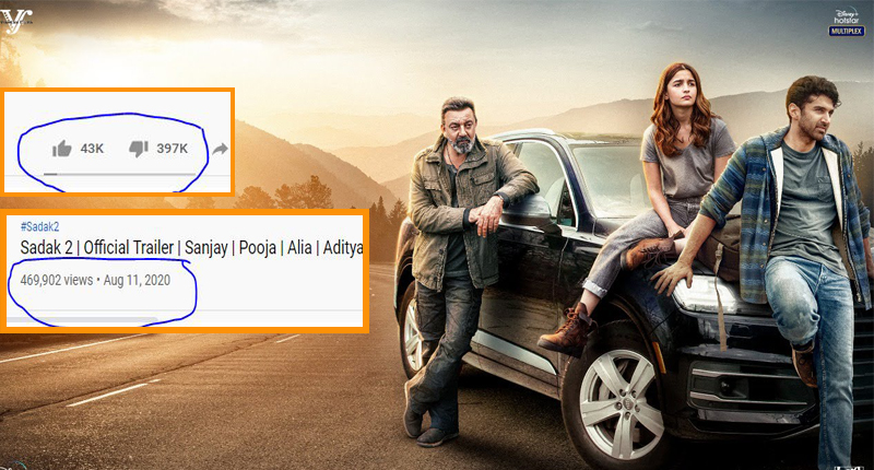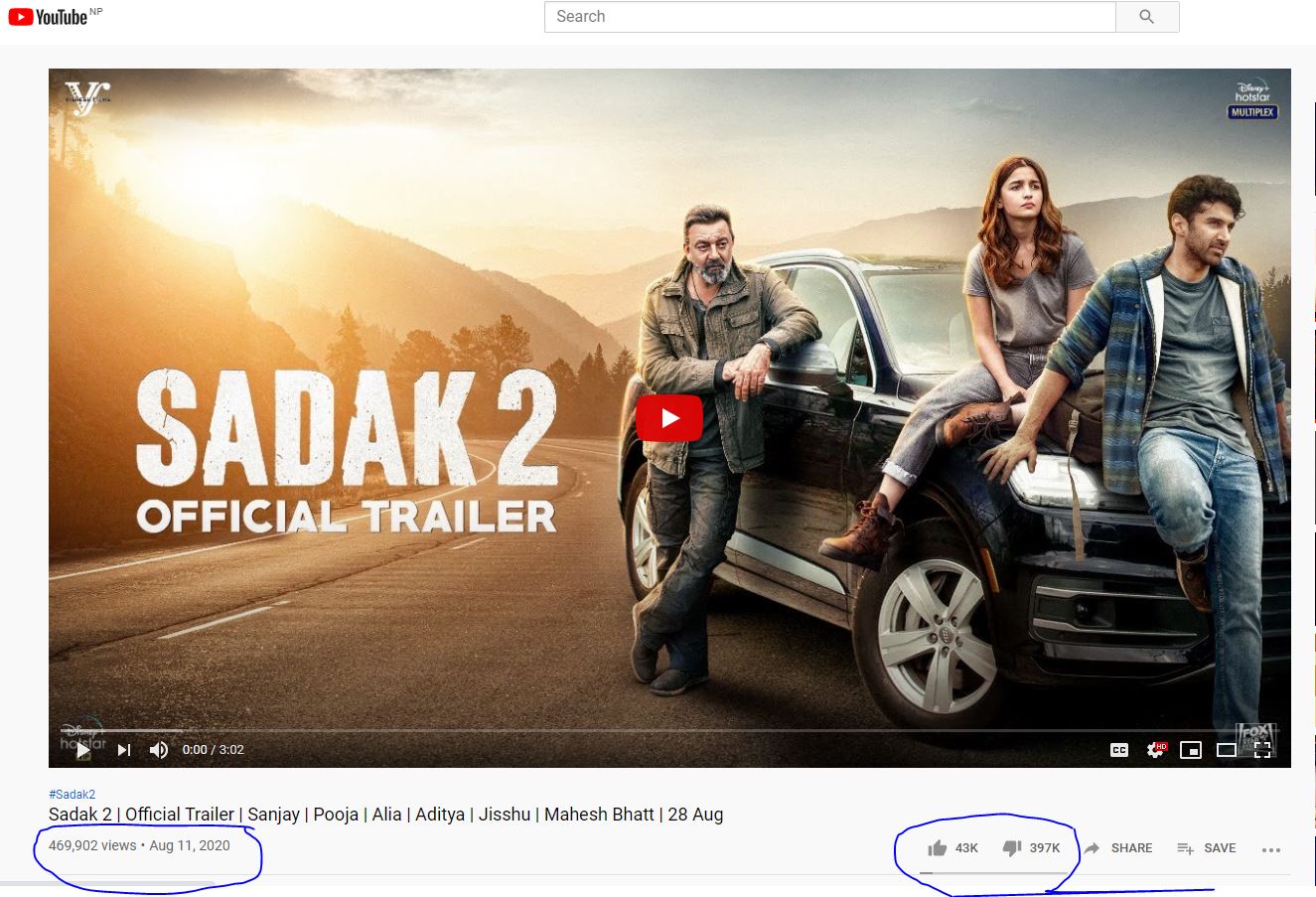 सामान्यतया जस्तो सुकै फिल्मको ट्रेलरमा पनि ९० प्रतिशत बढी लाइक आउछन । तर, ‘सडक २’को हकमा उल्टो भैदिएको छ । ‘नेपोटिज्म’ मुद्धा चर्किदा ‘सडक २’ त्यसको प्रत्यक्ष मारमा परेको छ ।