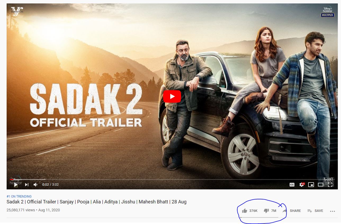 किन विश्वकै सर्वाधिक डिसलाइक पाउने ट्रेलर बन्यो ‘सडक २’ ?