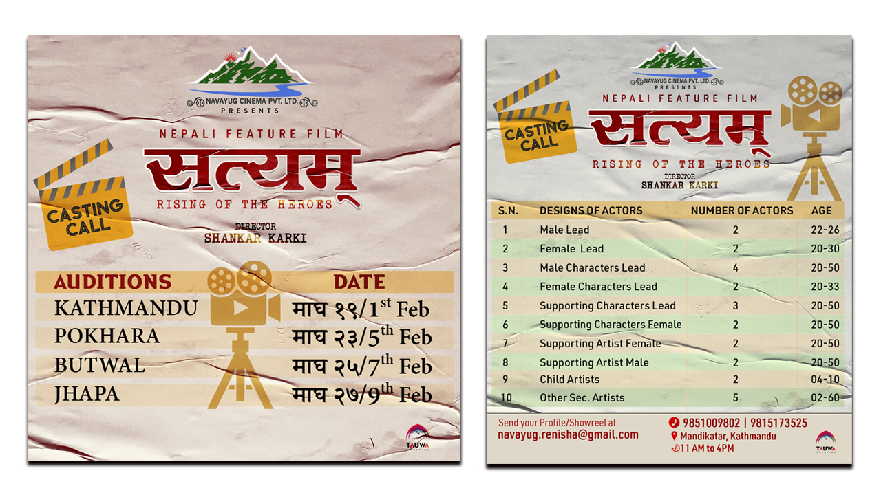 अडिसनमा सहभागी हुन इच्छुकहरुले फिल्म निर्माण कम्पनि ‘नवयुग सिनेमा प्रालिको इमेल ठेगाना ‘[email protected]‘ मा आफ्नो प्रोफाइल तथा शोरिल पठाउनु पर्नेछ ।