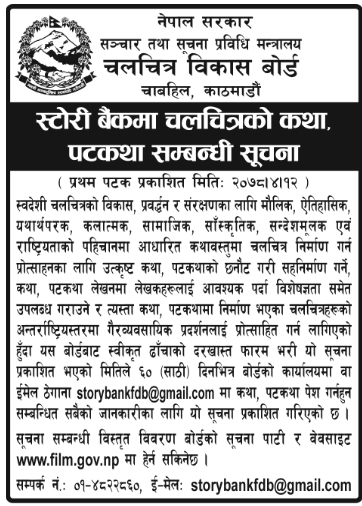 चलचित्र बिकास बोर्डले स्थापना गरेको स्टोरी बैंकमा फिल्मको कथा र पटकथा पेस गर्न सरकारले सुचना निकालेको छ ।