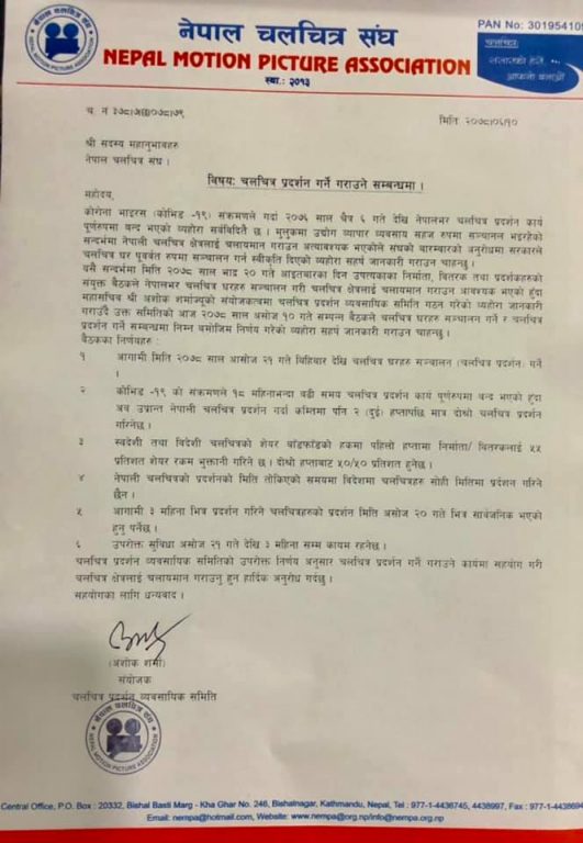 चलचित्र संघका महासचिव अशोक शर्माको संयोजकत्वमा सम्पन्न बैठकले ६ बुँदे निर्णय पनि सार्वजनिक गरेको छ ।