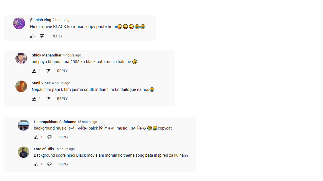 श्लोक मानन्धर नामका एक युट्युब प्रयोगकर्ता लेख्छन, ‘अनि पायो भन्दैमा २००५ को ब्ल्याकबाट म्युजिक हाल्दिने ।’ अर्का प्रयोगकर्ता लेख्छन, ‘ब्याकग्राउण्ड म्युजिक हिन्दि फिल्म ‘ब्ल्याक’को म्युजिकसँग मिल्छ, कपिक्याट ।’