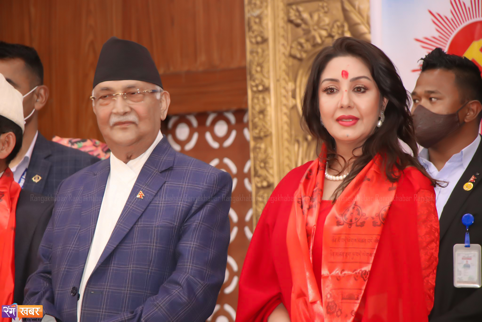 मंगलबार राजधानीको थापाथलीस्थित कार्की ब्यांक्वेटमा आयोजित पार्टी प्रवेश समारोहमा एमाले अध्यक्ष केपी शर्मा ओलीले माला र अबिर लगाइदिदै करिश्मालाई एमालेमा स्वागत गरे ।