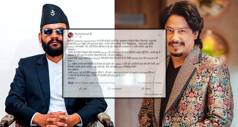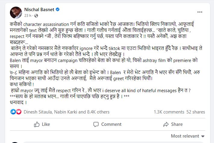 उनि लेख्छन, ‘कसैको चरित्र हत्या गर्न कति सजिलो भाको रहेछ आजकल। भिडियो क्लिप निकाल्यो, आफूलाई मनलागेको टेक्स लेख्यो अनि सुरु हुन्छ खेला । गाली गलौच गर्नलाई औंला चिलाईहल्छ… “खाते काले, चुतिया , रेस्पेक्ट गर्न नसक्ने *जी , तेरो फिल्म बहिष्कार गर्नु पर्छ, यस्ता पनि कलाकार रे !! यस्तै अनेकौं, अझ कडा शब्दहरू… बालेनले गरेको नमस्कार मैले नफर्काएर इग्नोर गरे भन्दै टिकटकमा एउटा भिडियो भाइरल हुँदै रहेछ। साथीभाइले आफन्त ले पनि प्रश्न गर्न थाले के गरेको तैंले भन्दै । त्यहि भएर लेख्दैछु । बालेनलाई मेयर बनाउन अभियान चलिरहेको बेलाकाे कथा हो। यो, चिसो एस्ट्रे फिल्मकाे प्रिमियरकाे समय करिब ७-८ महिना अगाडिकाे भिडियो हो। त्यहि बेलाकाे इभेन्टकाे । बालेन र मेरो भेट अगाडि नै भएर सँग सँगै थियौं, अरु चिनजान भएका साथी आउँदा उनले अरूलाई, मैले अरूलाई अभिवादन गरिरहेका थियौं। कथा सकियो ! हाम्रो मेयर ज्यू लाई मैले रेस्पेक्ट गरिन रे , त्यहि भएरम सबै प्रकारका घृणित सन्देशहरूको योग्य छु हैन त ?