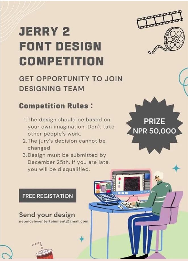रंगखबर, काठमाडौँ: घोषणा देखिनै चर्चामा रहेको फिल्म हो ‘जेरी २’। हेमराज बिसीले निर्देशन गर्ने फिल्म अहिले अर्को बिषय ‘टाइटल फन्ट डिजाइन कम्पिटिसन’ले चर्चित बनेको छ। निर्माण टिमले पौष १० गते भित्र जो कोहि प्रतिष्पर्धीहरुले ‘टाइटल फन्ट डिजाइन’ गरि ‘[email protected]’ ठेगानामा पठाइसक्नु पर्ने सर्त ल्याएको छ। साथै फन्ट अरु कसैको कपि भएमा मान्य नहुने पनि बताएको छ। निर्णायक मण्डलको मुल्यांकनका आधारमा विजेता छनोट हुने भएकाले निर्धारित मिति भन्दा ढिलो पठाईएको डिजाईन स्वत: रद्ध हुने जानकारी पनि निर्माण टिमले दिएको छ। विजेताले ५० हजार नगद प्राप्त गर्नेछन र विजेताको डिजाईन फिल्ममा समावेश हुनेछ।