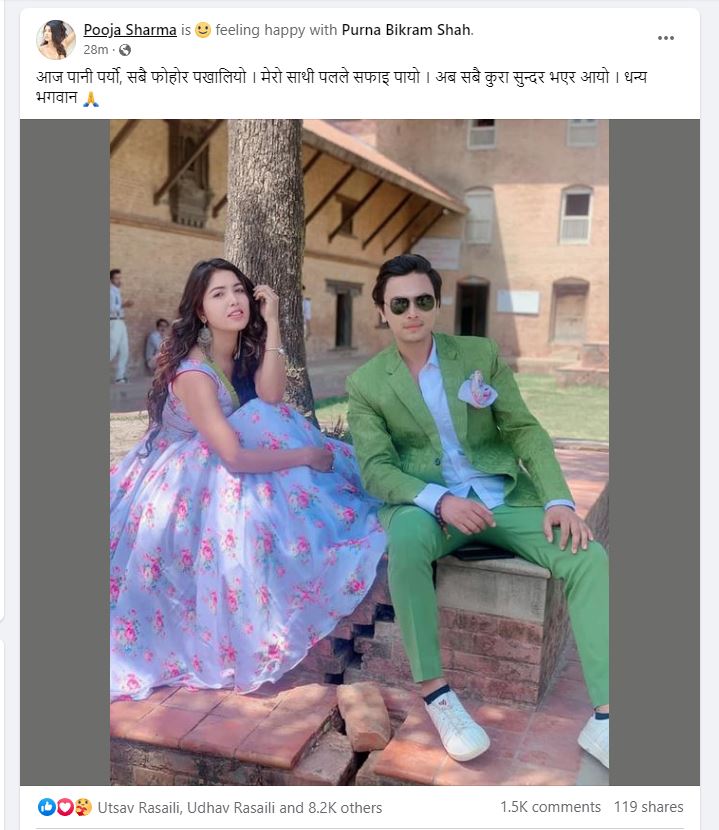 पलले सफाई पाउने बित्तिकै अभिनेत्री पूजा शर्माको खुसीको सिमा रहेको छैन उनले हतार हतार आफ्नो सामाजिक संजाल फेसबुक मार्फत खुसी साटेकी छन। उनि लेख्छिन ‘आज पानी पर्यो, सबै फोहोर पखालियो । मेरो साथी पलले सफाइ पायो । अब सबै कुरा सुन्दर भएर आयो । धन्य भगवान 🙏’