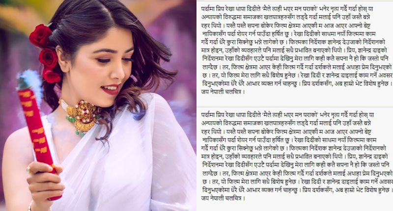 उनि लेख्छिन ”पर्दामा प्रिय रेखा थापा दिदीले ‘मैले त्यही भएर मन पराको’ भनेर नृत्य गर्दै गर्दा होस् या अन्यायको विरुद्धमा समाजका खलपात्रहरुसँग लड्दै गर्दा मलाई पनि उहाँ जस्तै बन्ने रहर थियो । यस्तै यस्तै सपना बोकेर फिल्म क्षेत्रमा आएकी म आज आएर आफ्नो बेष्ट नायिकासँग पर्दा शेयर गर्न पाउँदा हर्षित छु । रेखा दिदीको साथमा नयाँ फिल्ममा काम गर्दै गर्दा धेरै कुरा सिक्नेछु भन्ने लागेको छ । फिल्मका निर्देशक ज्ञानेन्द्र देउजाको निर्देशनको मात्र होइन, उहाँको व्यवहारले पनि मलाई सधै प्रभावित बनाएको थियो । प्रिय, ज्ञानेन्द्र दाइको निर्देशनमा रेखा दिदीसँग एउटै पर्दामा देखिनु मेरा लागि कही कतै सपना नै हो कि जस्तो पनि लाग्दैछ । तर, फिल्म क्षेत्रमा आएर केही फिल्म गर्दै गर्दा दर्शकले मलाई अथाहा प्रेम दिनुभएको छ । तर, यो फिल्म मेरा लागि सधै बिशेष हुनेछ । रेखा दिदी र ज्ञानेन्द्र दाइलाई काम गर्ने अवसर दिनुभएकोमा धेरै धेरै आभार व्यक्त गर्न चाहन्छु ।