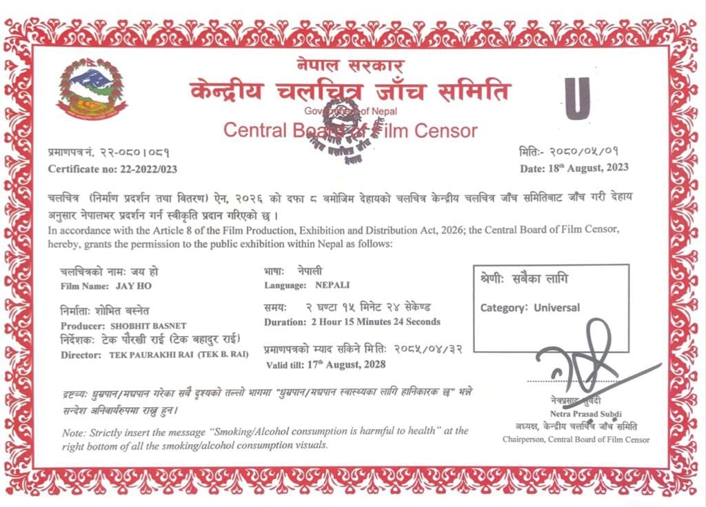 रंगखबर, काठमाडौँ: आउँदो शुक्रबारबाट देशभर एकसाथ प्रदर्शन हुने फिल्म जय होलाई सेन्सर बोर्डले पास गरेको छ। शुक्रबार सेन्सर बोर्डले फिल्मलाई युनिभर्सल सर्टिफिकेट थमाउदै रिलिज इजाजत दिएको हो। अब भने शोभित बस्नेत निर्मित फिल्मलाई सबै उमेर समूहका दर्शकले हेर्न पाउँने छन।