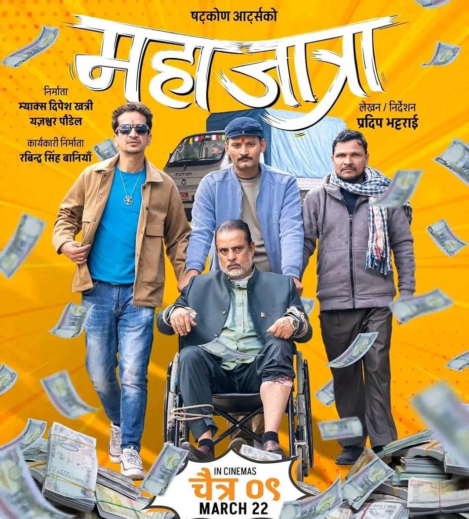 रंगखबर, काठमाडौँ: ‘जात्रा’ र ‘जात्रै जात्रा’को सफलता पछि निर्देशक प्रदिप भट्टराई निर्देशित जात्राको तेश्रो सिक्वेल ‘महाजात्रा’ फर्स्टलुक्स पोस्टर सार्वजनिक गरिएको छ। सार्वजनिक पोस्टरमा अभिनेता हरिवंश आचार्य, बिपिन कार्की, रविन्द्रसिंह बानियाँ र रविन्द्र झालाई प्रस्तुत गरिएको छ। ‘जात्रा’ देखि नै फडिन्द्र (विपिन), जोयश (रवीन्द्र बानियाँ) र मुन्ना (रवीन्द्र झा)को भूमिका देखिदै आएका तीन पात्रले अभिनेता आचार्यलाई ह्वीलचेयरमा लागिरहेका छन् । उनीहरूले अभिनेता आचार्यलाई बन्दी बनाएको संकेत पोस्टरले गरेको छ ।