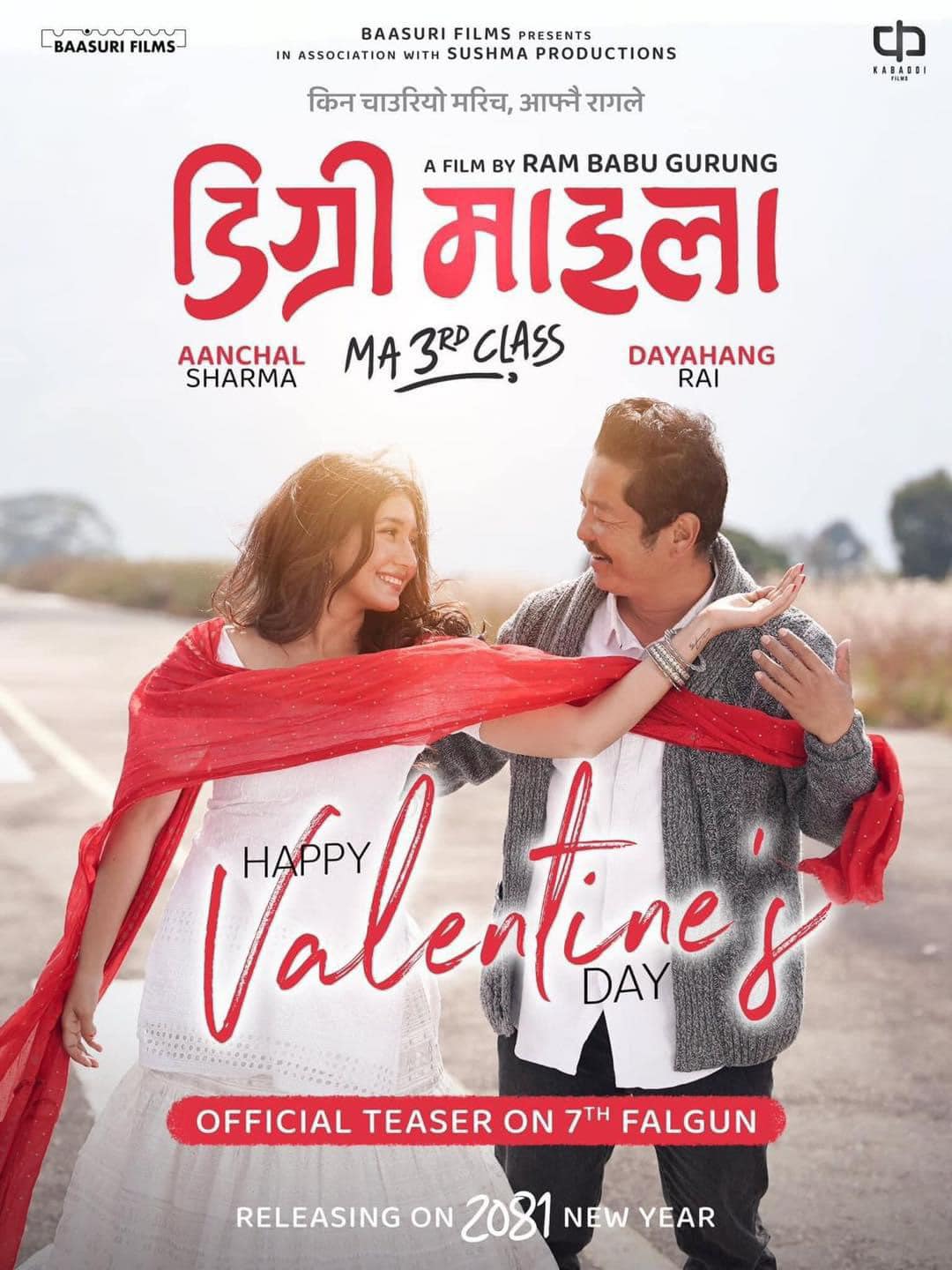 रंगखबर, काठमाडौँ: बाँसुरी फिल्मसको ब्यानरमा निर्माण भएको फिल्म ‘डिग्री माइला : एमए थर्ड क्लास’ नयाँ पोस्टर सार्वजनिक गरिएको छ। भ्यालेनटाईन डेको अवसर पारेर निर्माण टिमले उक्त पोस्टर सार्वजनिक गरेको हो। सार्वजनिक पोस्टरमा अभिनेता दयाहाङ राई र अभिनेत्री आँचल शर्मा रोमान्टिक बनेका छन। यी दुई रुम्जाटार विमानस्थलको रनवेमा प्रेमिल बनेको देख्न सकिन्छ। पोस्टर सार्वजनिकसँगै निर्माण टिमले फिल्मको टिजर फागुन ७ गते रिलिज गर्ने जानकारी दिएको छ।
