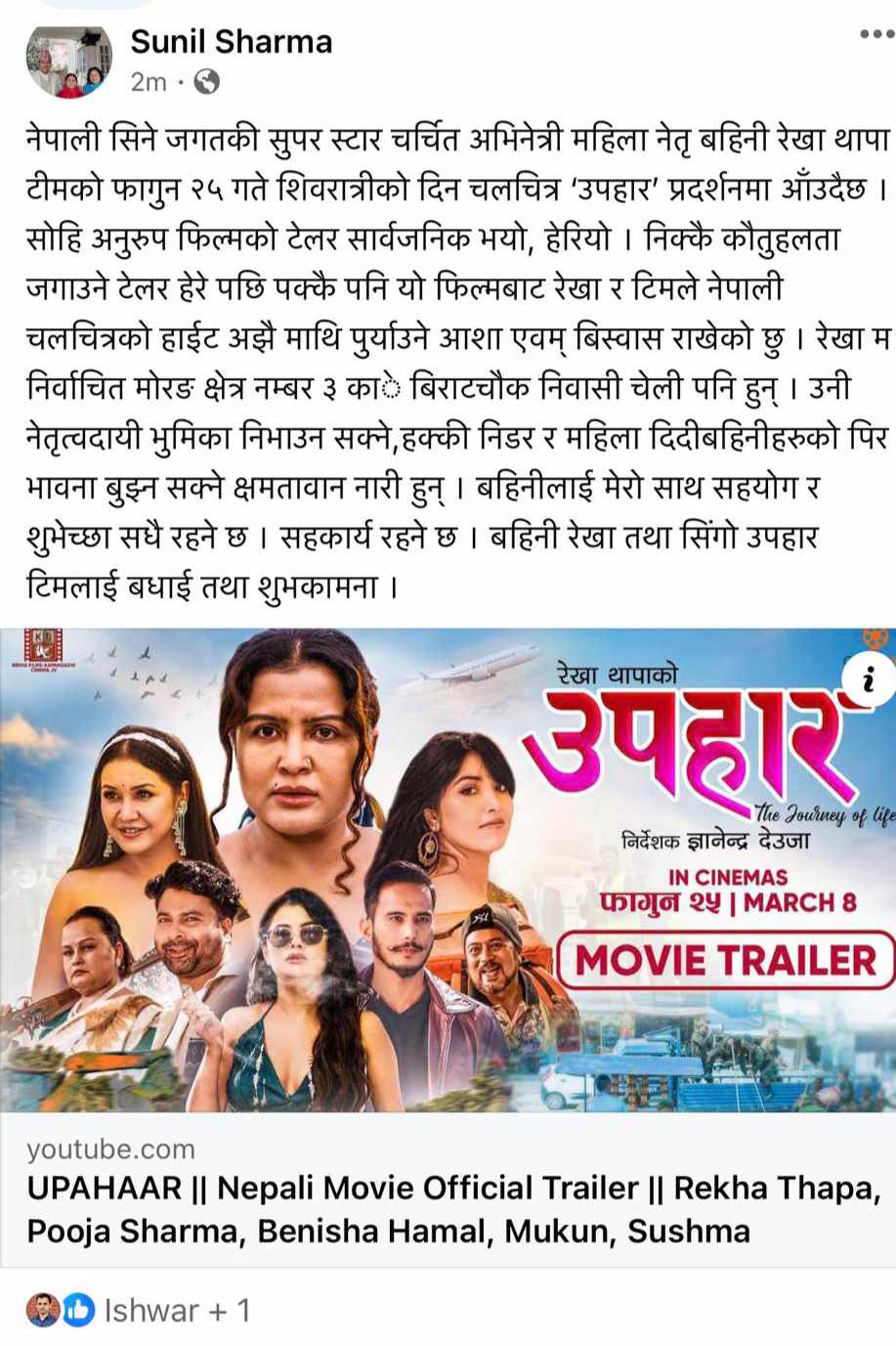 ‘नेपाली सिनेजगतकी सुपरस्टार चर्चित अभिनेत्री महिला नेतृ बहिनी रेखा थापा टिमको फागुन २५ गते शिवरात्रीको दिन चलचित्र ‘उपहार’ प्रदर्शनमा आँउदैछ । सोहि अनुरुप फिल्मको ट्रेलर सार्वजनिक भयो, हेरियो । निक्कै कौतुहलता जगाउने ट्रेलर हेरे पछि पक्कै पनि यो फिल्मबाट रेखा र टिमले नेपाली चलचित्रको हाईट अझै माथि पुर्याउने आशा एवम् विस्वास राखेको छु’, उनले लेखेका छन् ।