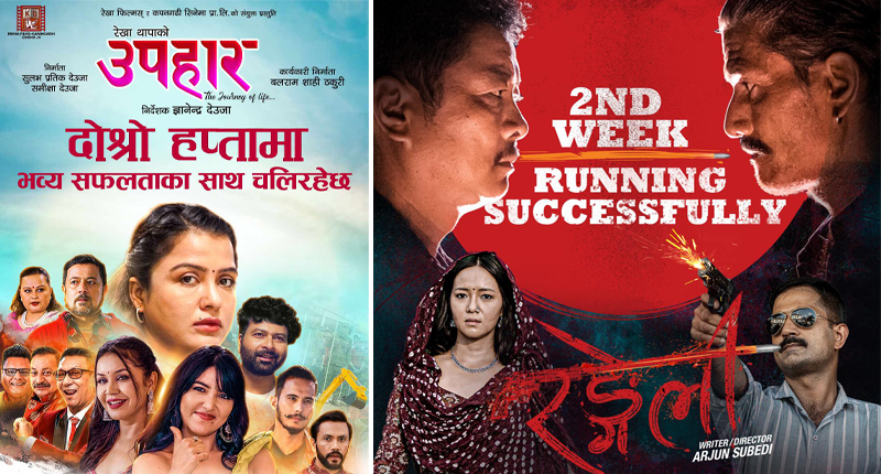 रंगखबर, काठमाडौँ: गत फागुन २५ गते महाशिवरात्रिको अवसर पारेर प्रदर्शनमा आएका फिल्महरु ‘उपहार’ र रङ्गेली दोस्रो सातामा प्रवेश गरेका छन । दोस्रो सातामा पनि फिल्महरुले दर्शकको अभाव भोग्नु परेको छैन । दर्शकबाट राम्रो वर्ड अफ माउथ पाएकाले पनि दुवै फिल्म पहिलो हप्ताको शोलाई यथावत राख्दै दोस्रो सातामा प्रवेश गरेका हुन् ।