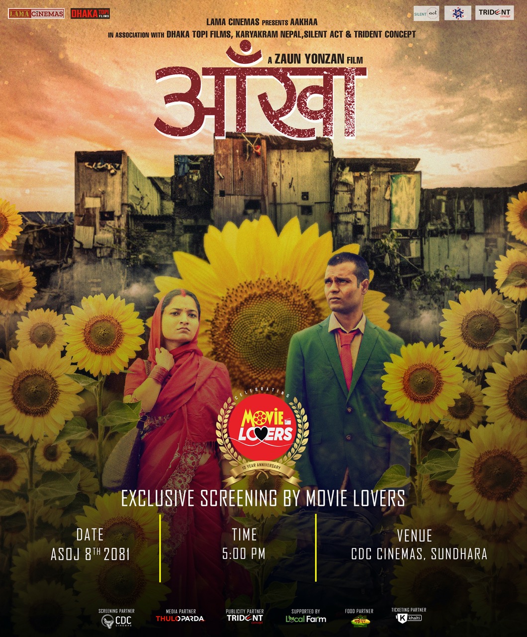 रंगखबर, काठमाडौँ: सामाजिक सञ्जालमा चर्चित ‘मुभी लभर्स ग्रुप’ले असोज ८ गते चलचित्र ‘आँखा’को विशेष प्रदर्शन गर्ने भएको छ । जौन योञ्जनको निर्माण र निर्देशनमा बनेको ‘आँखा’ले सहरी गरिब र सुकुम्वासीको कथा बोकेको छ । पोस्टर र टिजर सार्वजनिक भएसँगै ‘आँखा’ले दर्शकको ध्यान तानेको थियो ।