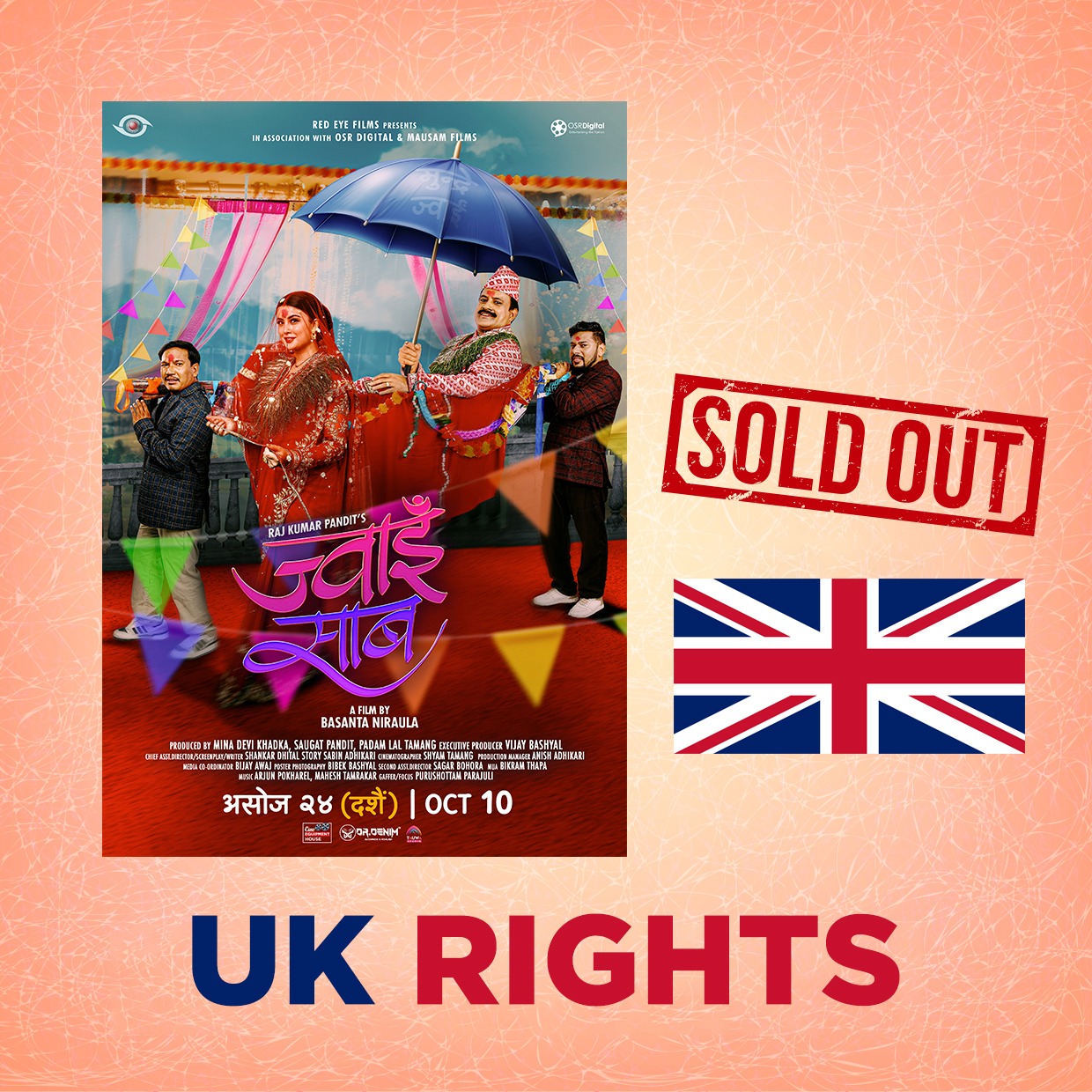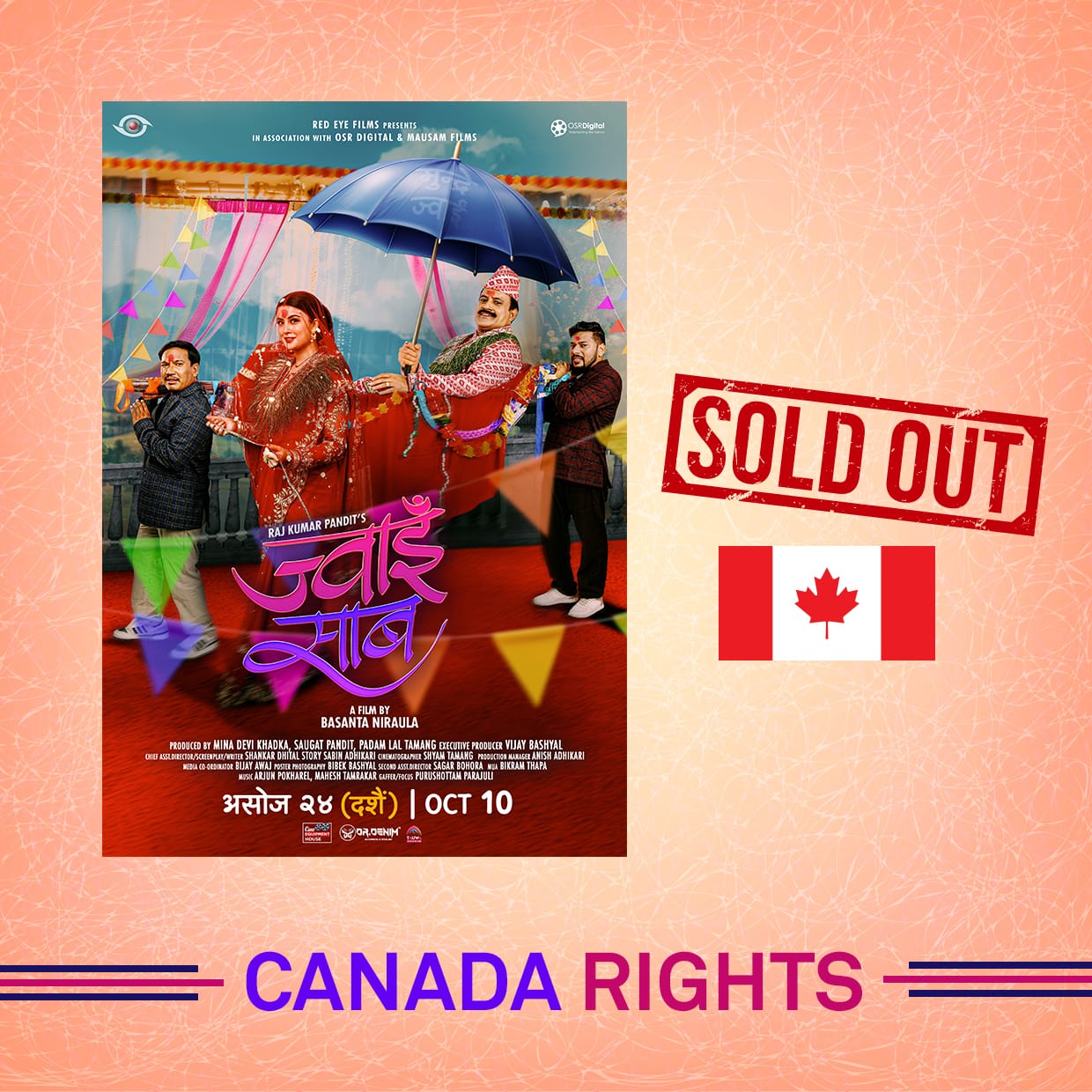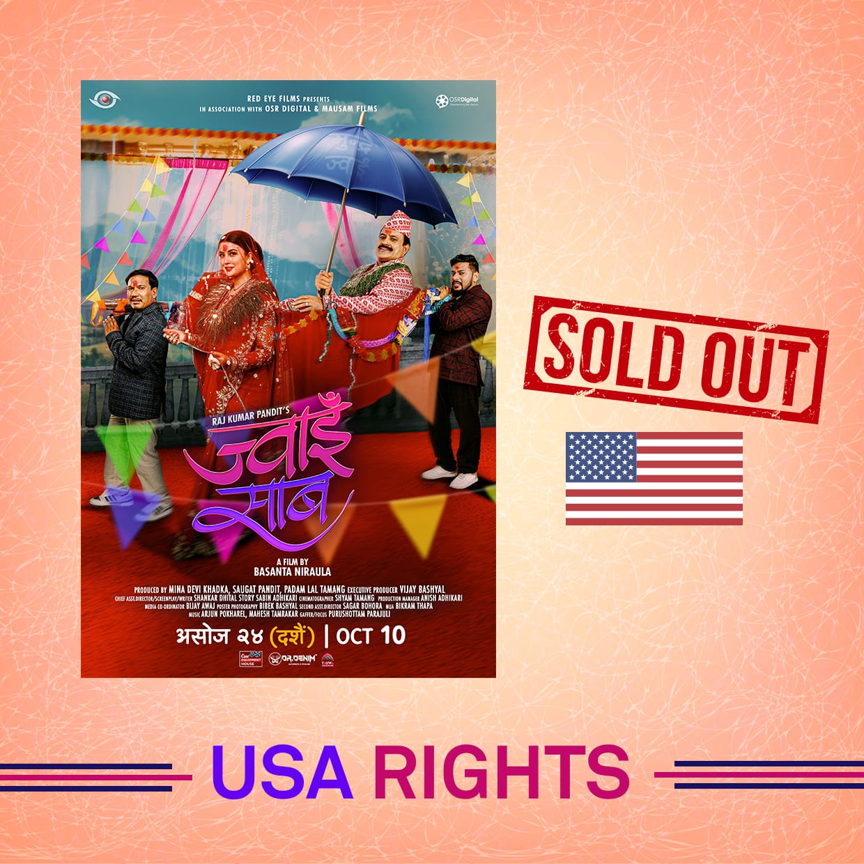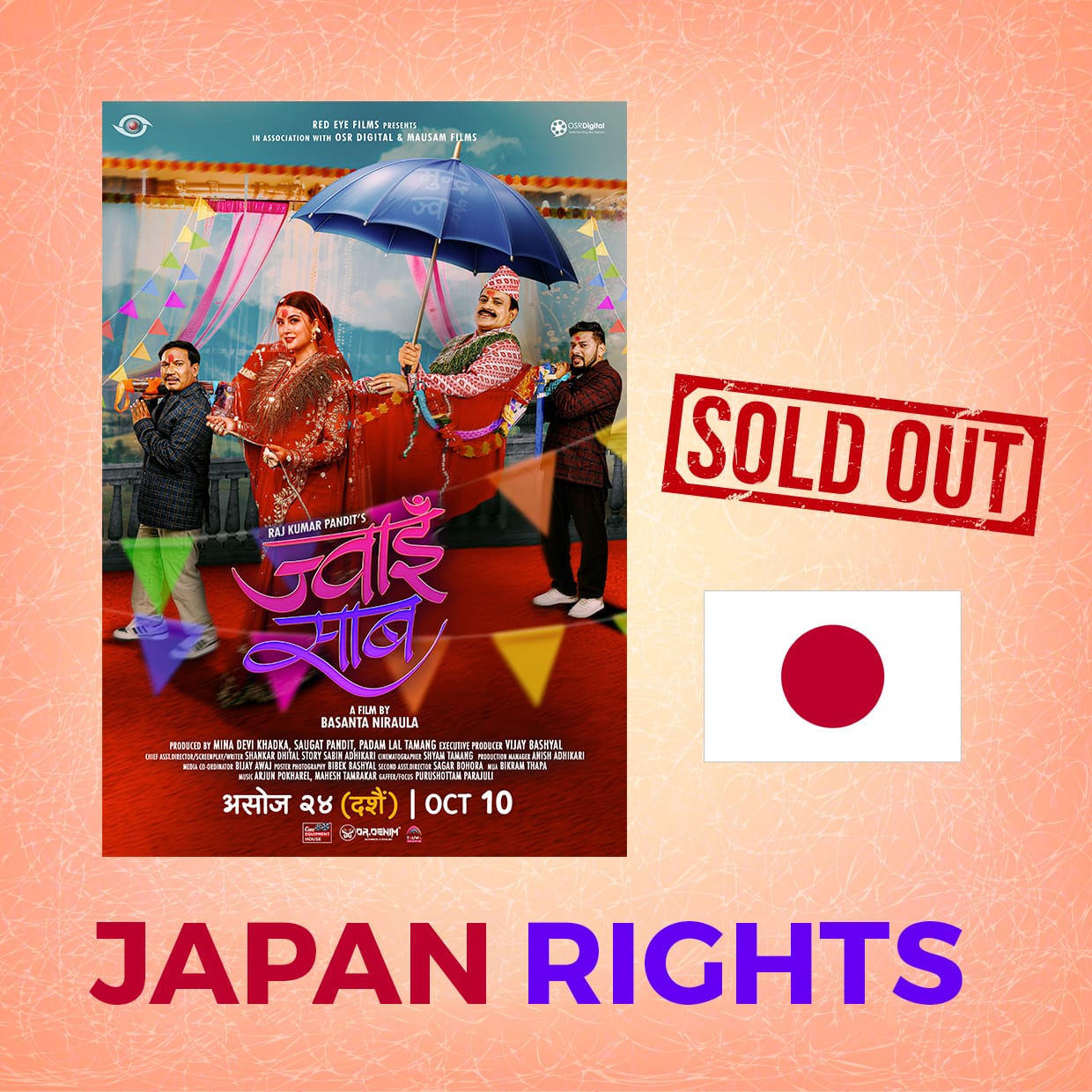 रंगखबर, काठमाडौँ: दशैंको अवसर पारेर यही असोज २४ गते फूलपातीको दिन रिलिज हुने फिल्म ‘ज्वाइँ साब’को अन्तर्राष्ट्रिय प्रदर्शन अधिकार बिक्री भएको छ । निर्माण पक्षका अनुसार अमेरिका, क्यानडा, यूके र जापानको प्रदर्शन अधिकार बिक्री भएको हो ।