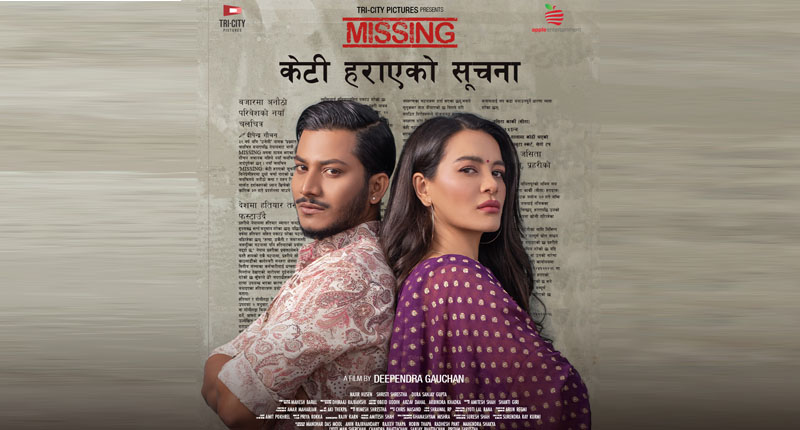 रंगखबर, काठमाडौँ: फिल्म ‘मिसिङः केटी हराएको सूचना’ को दोस्रो पोस्टर आज सार्वजनिक भएको छ। पोस्टरमा फिल्मका मुख्य पात्रहरू नाजिर हुसेन र सृष्टि श्रेष्ठलाई केही गम्भीर भावमा देखाइएको छ । यसअघि सार्वजनिक पहिलो पोस्टरमा निकै हसमुख मुद्रामा देखिएका नाजिर र सृष्टिलाई दोस्रो पोस्टरमा फरक मुडमा देखाइएको छ । पोस्टरमा नाजिर र सृष्टि सामान्य पहिरनमा छन् ।
