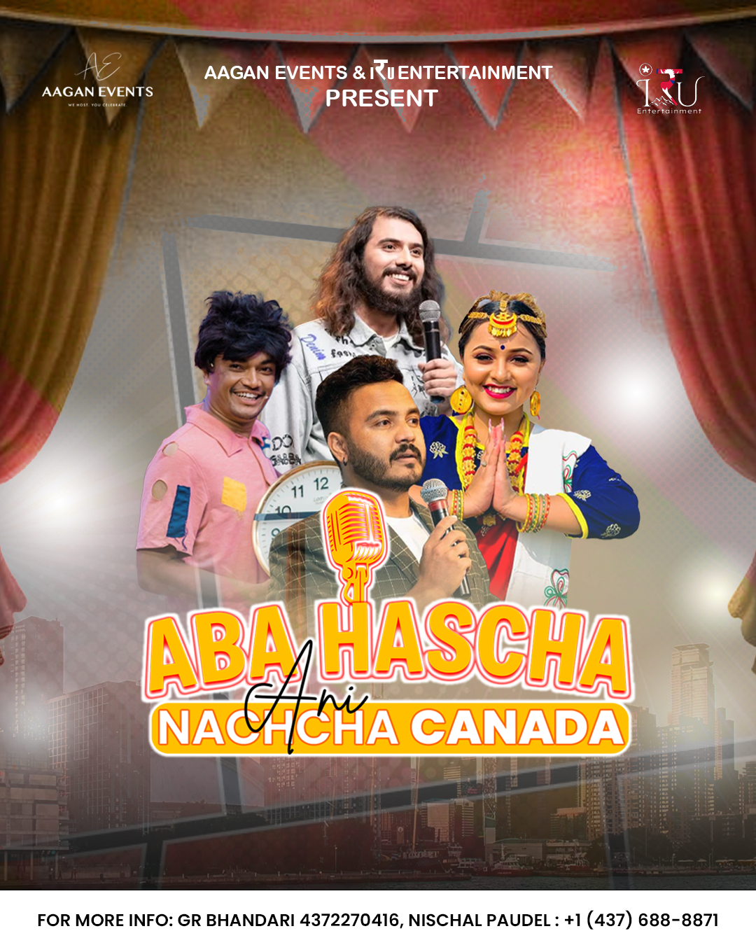 रंगखबर, काठमाडौँ: आई र यू इन्टरटेनमेन्ट र आगन इभेन्ट्सको संयुक्त प्रस्तुतीमा ‘अब हाँस्छ अनि नाच्छ क्यानडा’ नामक शो हुने भएको छ । यो कार्यक्रम आगामी जुन र जुलाई महिनामा क्यानडाको विभिन्न सहरमा हुने आयोजक मध्येका एक जीआर भण्डारीले जानकारी दिए ।