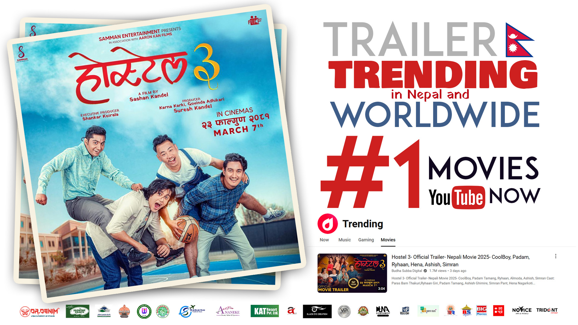 रंगखबर, काठमाडौँ: नेपाली चलचित्र ‘होस्टेल ३’को गत शुक्रवार सार्वजनिक भएको ट्रेलरले व्यापक हाइप प्राप्त गरेको छ । रिलिजको ६ घण्टामै युट्युबको ट्रेन्डिङ यात्रा सुरु गरेको ट्रेलरले २१ घण्टामा नै १० लाख भ्युज प्राप्त गरेको थियो भने नेपालमा फिल्म सेक्सनमा पहिलो स्थानमा र करिब १५ वटा देशमा ट्रेन्डिङमा आएको थियो, जुन अहिलेसम्म पनि कायमै छ ।