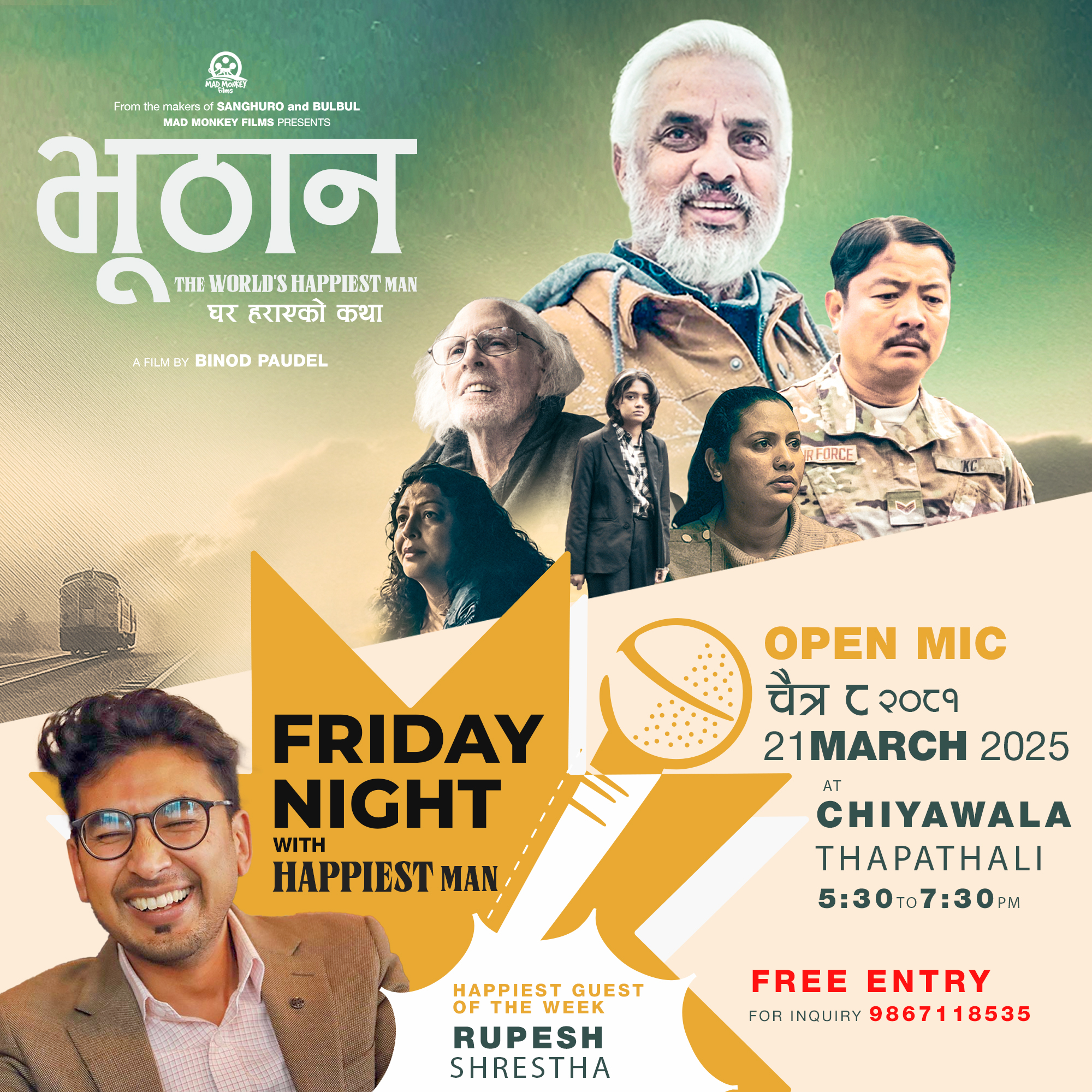 रंगखबर, काठमाडौँ: आगामी वैशाख १२ मा प्रदर्शन हुन लागेको फिल्म भूठानले हरेक शुक्रवार काठमाडौका चल्तीका चियापसल र रेष्टुँराहरुमा फ्राईडे नाईट विथ ह्याप्पियस्ट म्यान क्याम्पेन गर्ने भएको छ ।
