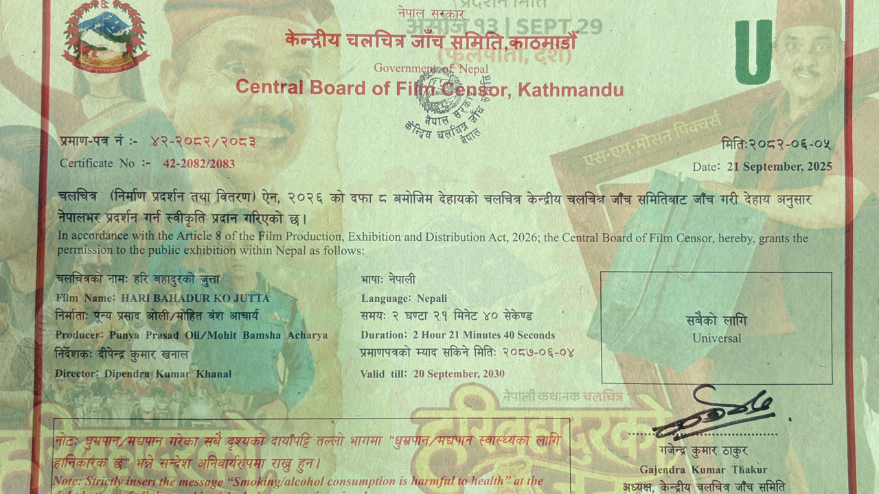 रंगखबर, काठमाडौँ: यो बर्षको प्रतिक्षित चलचित्र ‘हरिबहादुरको जुत्ता’ को सेन्सर पास भएको छ। केन्द्रिय चलचित्र जांच समिति (सेन्सर बोर्ड) ले चलचित्रलाई युनिभर्सल सर्टिफिकेट दिएको छ। अव यो चलचित्र सवै उमेर समुहका दर्शकले हेर्न पाउनेछन्। सेन्सर बोर्डका कार्यसमितिका सदस्य चलचित्रको क्लाइमेक्स हेरेर भावुक बनेका थिए। चलचित्र हसाउदा हसाउदै भावुक बनाउने बनेको सेन्सर बोर्डका सदस्यले प्रतिक्रिया दिएका थिए।