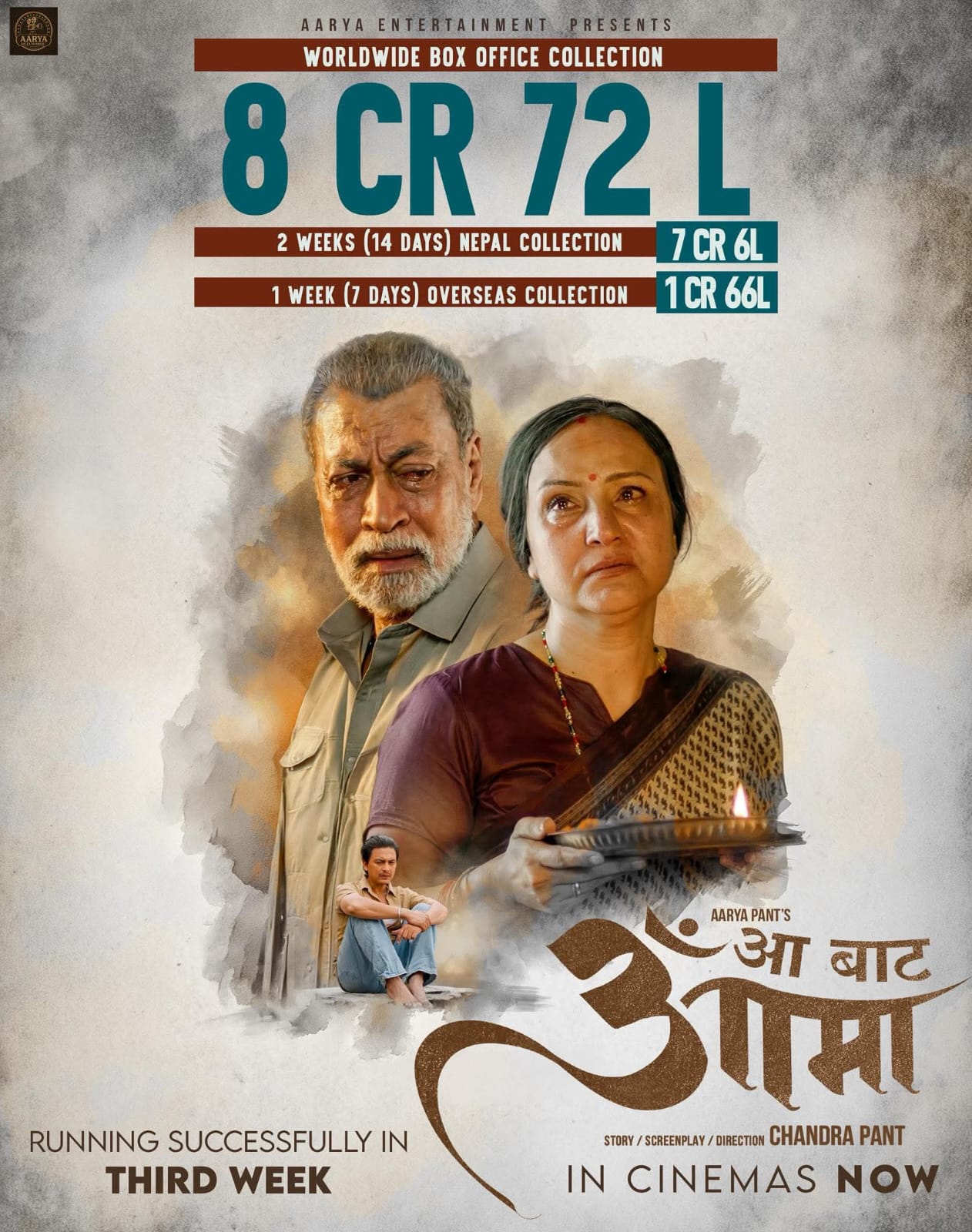 चन्द्र पन्त निर्देशित फिल्म ‘आ बाट आमा’ले ९ करोड नजिक कमाई गरिसकेको छ। गत माघ १६ गतेबाट प्रदर्शनमा आएको यो फिल्मले अहिलेसम्म ८ करोड ७२ लाख ग्रस कलेक्सन हो। पहिलो हप्ताभन्दा दोस्रो साता हलमा दर्शकको चाप बढेसँगै फिल्मको व्यापारमा छलाङ मारेको हो।